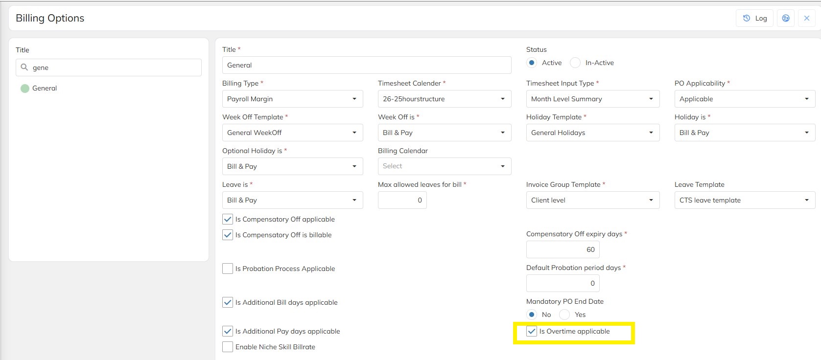- In that Billing option mapped ensure that the Overtime applicable checkbox has been enabled as shown below and then save the details.