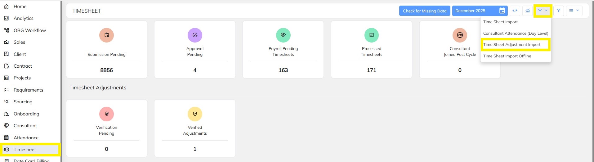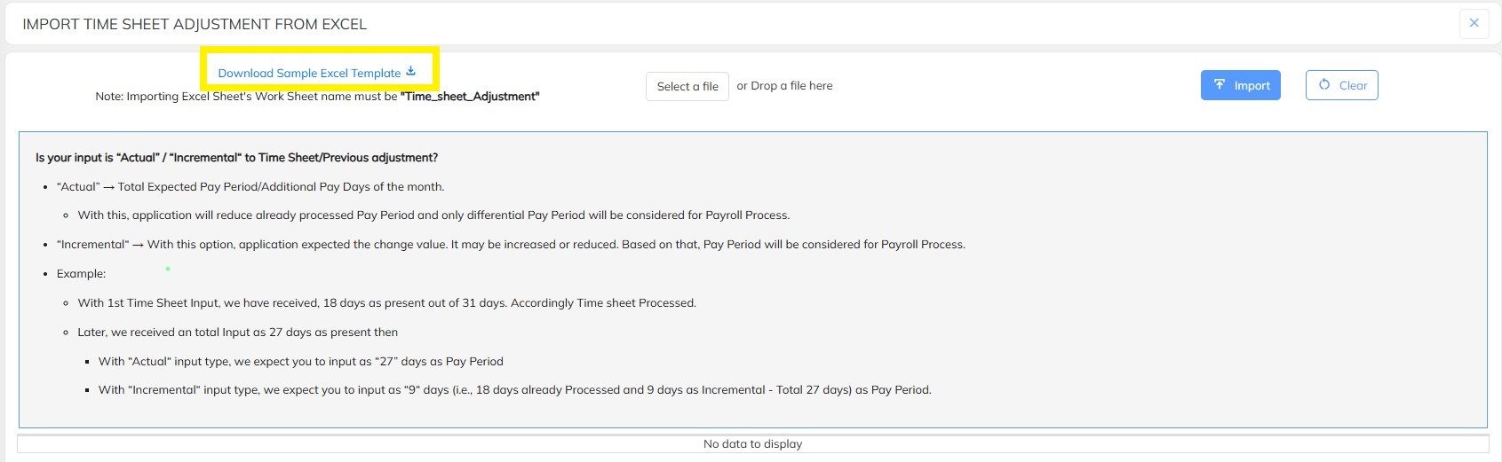 - Navigate on Import icon --> Timesheet Adjustment Import --> Download the Sample template