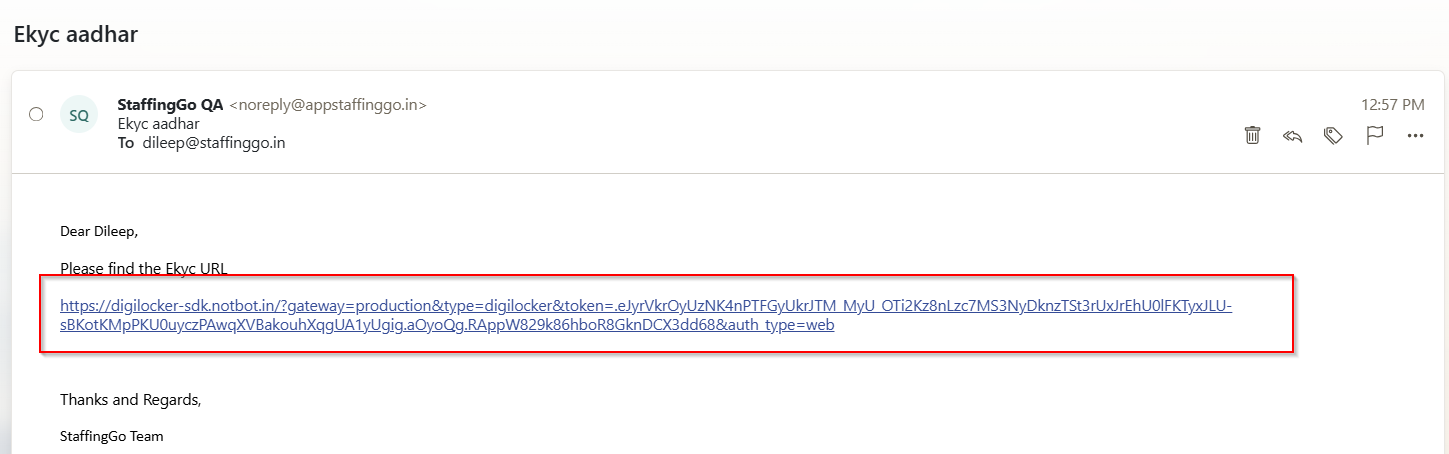 Employee receives an email with the DigiLocker eKYC link valid for 30 minutes.
