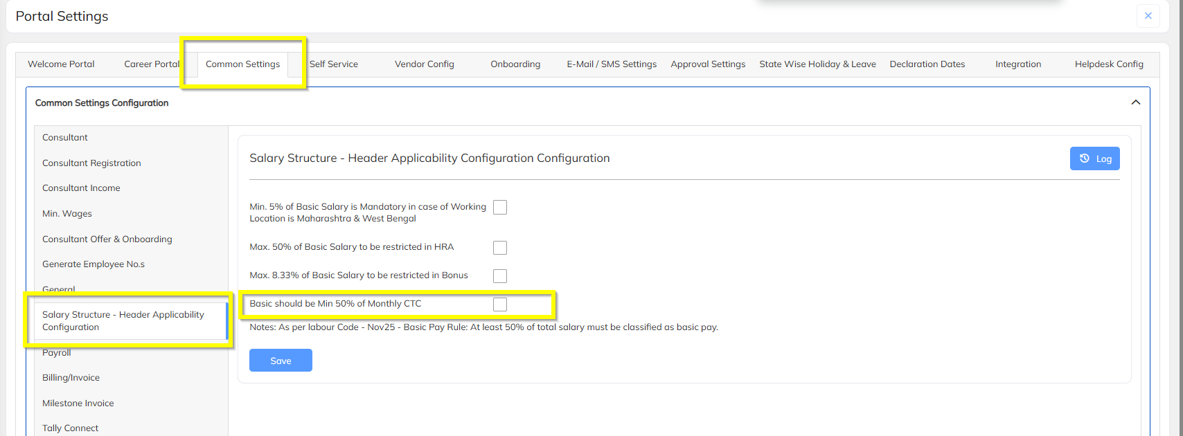 Portal Settings → Common setting → Salary Structure - Header Applicability Configuration Configuration