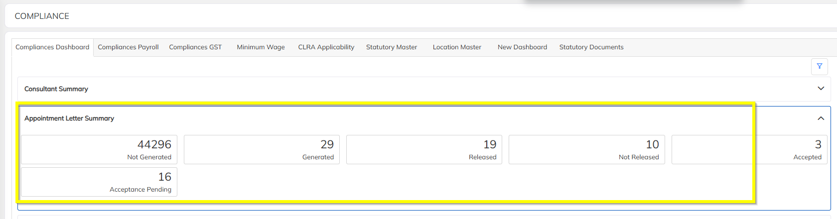 Appointment Letter Summary available in Compliance Module
