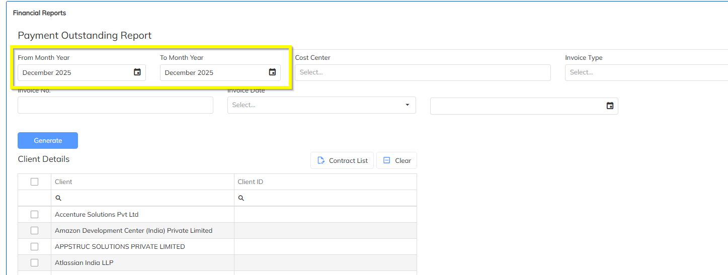 Month Range Filter supported in Payment Outstanding Invoice Report