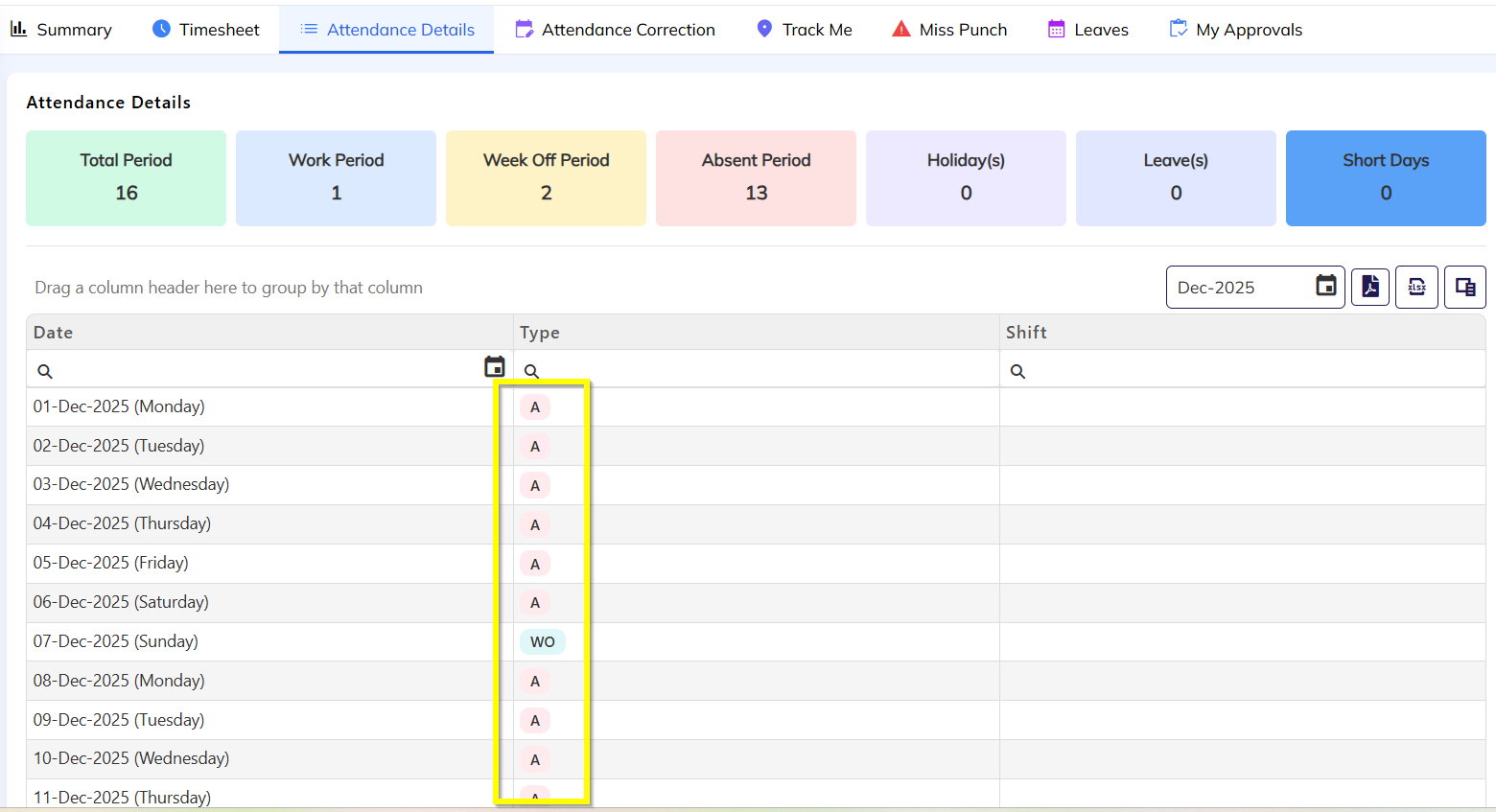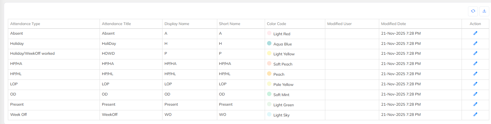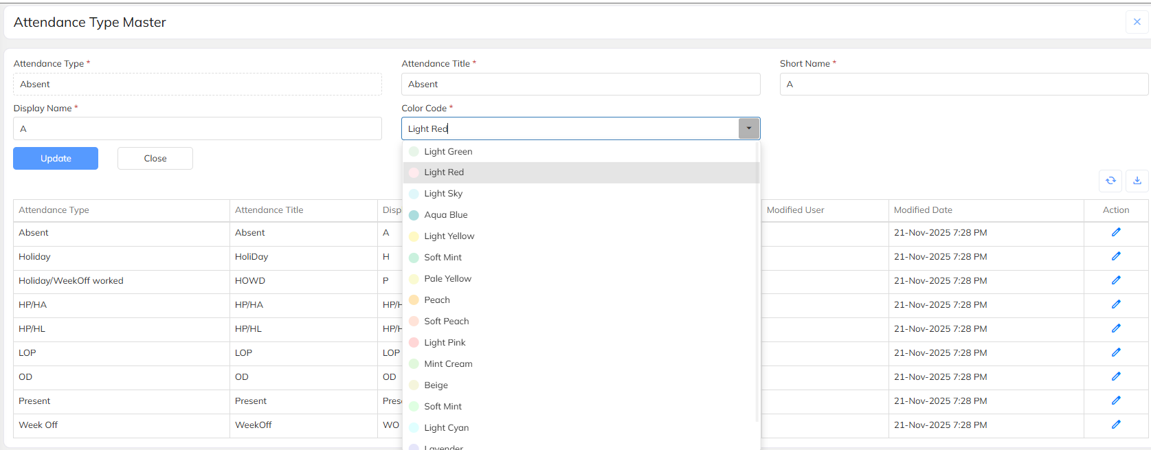 Color Coding supported for Attendance Types