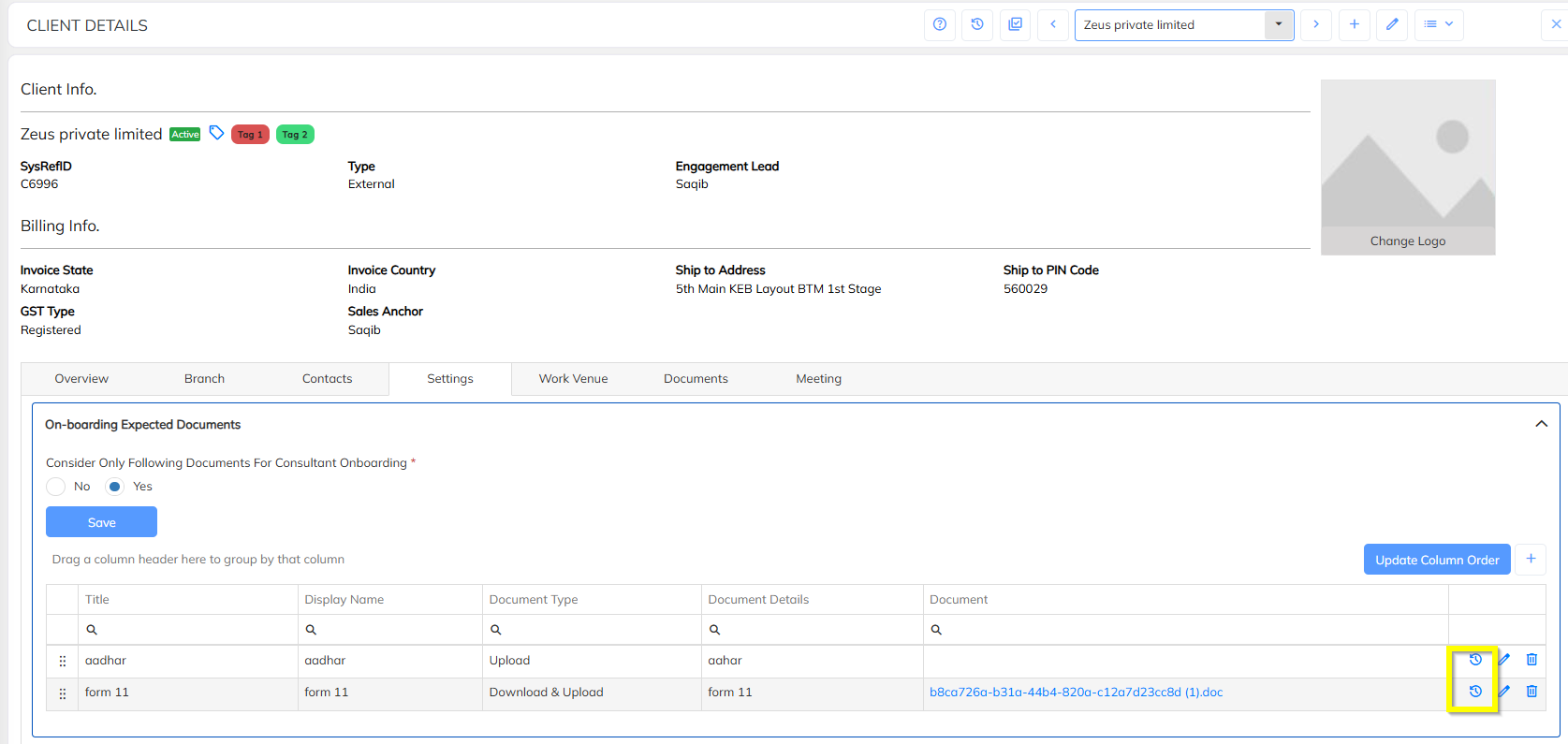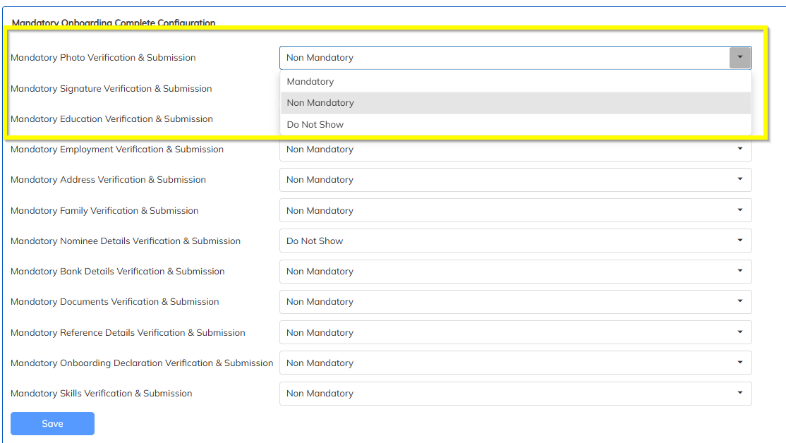 Ability to disable onboarding fields as per Client configuration