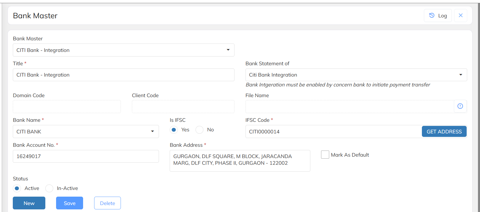 Select Integration Bank from the dropdown list if the bank is to be used for bank statement integration.