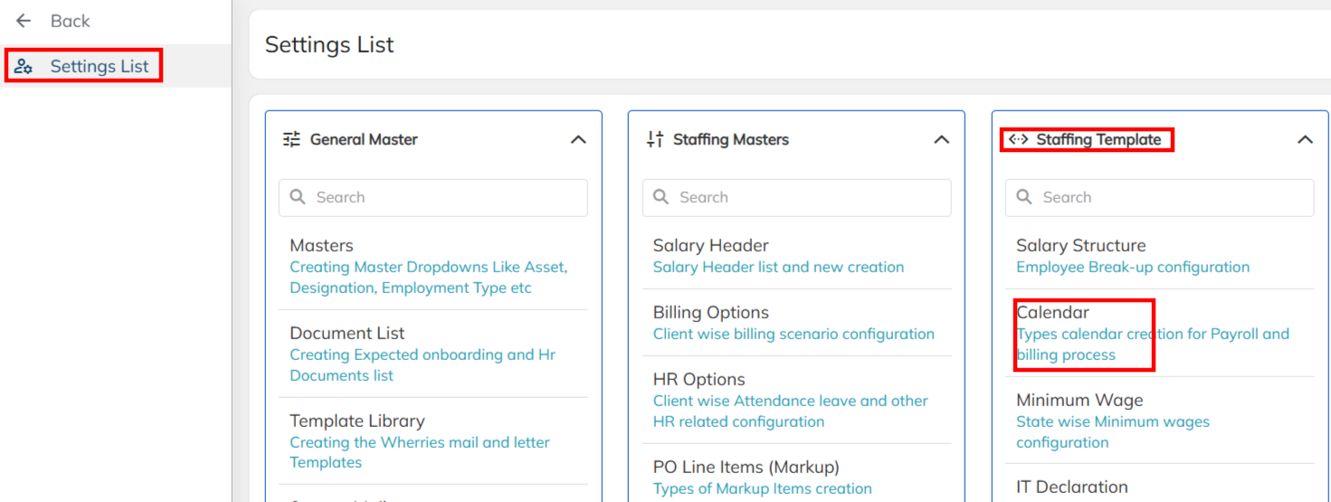 - Navigate to Setting >> Staffing Template >>Choose the Calendar.