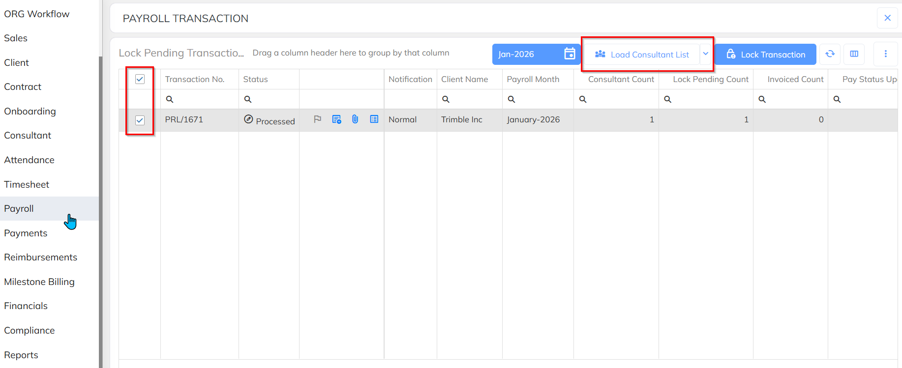 Step 1: Navigate to Payroll Module >> Select the Lock Pending option. Able to access to get the processed payroll transaction list client wise.