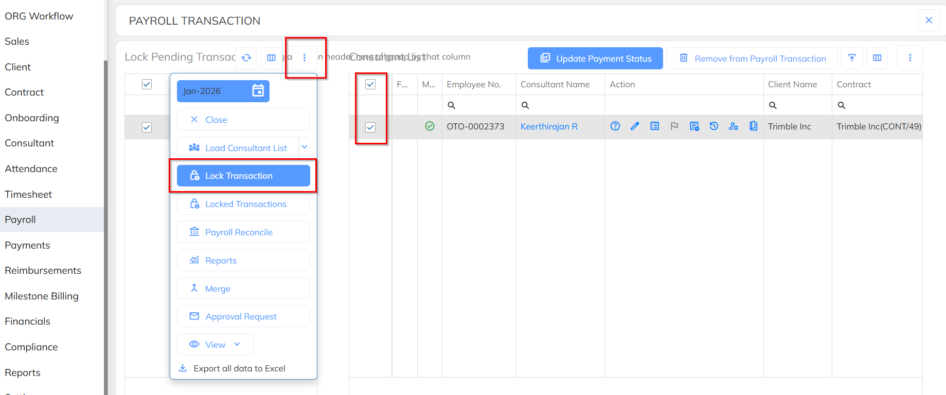 Step 3: Select the required Employees/Consultants >> Click the Left-side Menu >> Select Lock Transaction >>Yes/No.