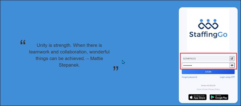 - Access ESS Web Portal using this link-https://emp.staffinggo.in/. For Mobile App download the StaffingGo Application in Play store https://play.google.com/store/search?q=staffinggo+ess+app&c=apps&