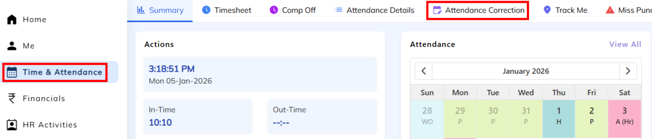 - Navigate to Time & Attendance Menu>> Select the Attendance Correction Option