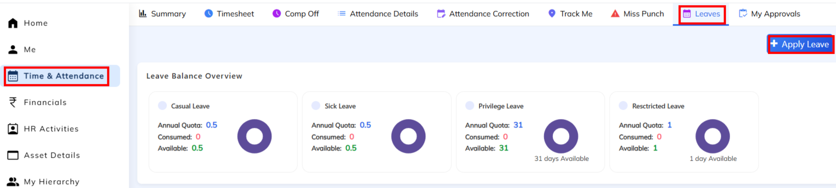 - Select + Apply Leave option and choose the available leave type along with dates