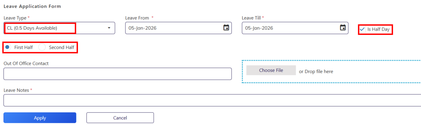 - Specify the Leave Type & Applicability period ( First Half Day/ Second Half Day) and submit for approval.