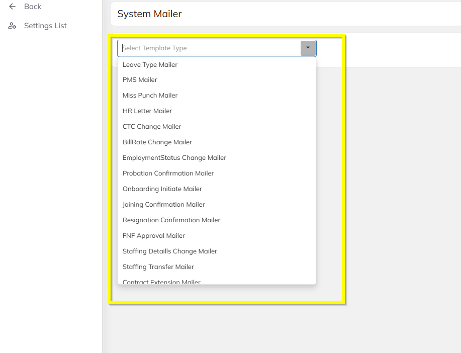 In the System Mailer screen, view the list of available mailer templates.