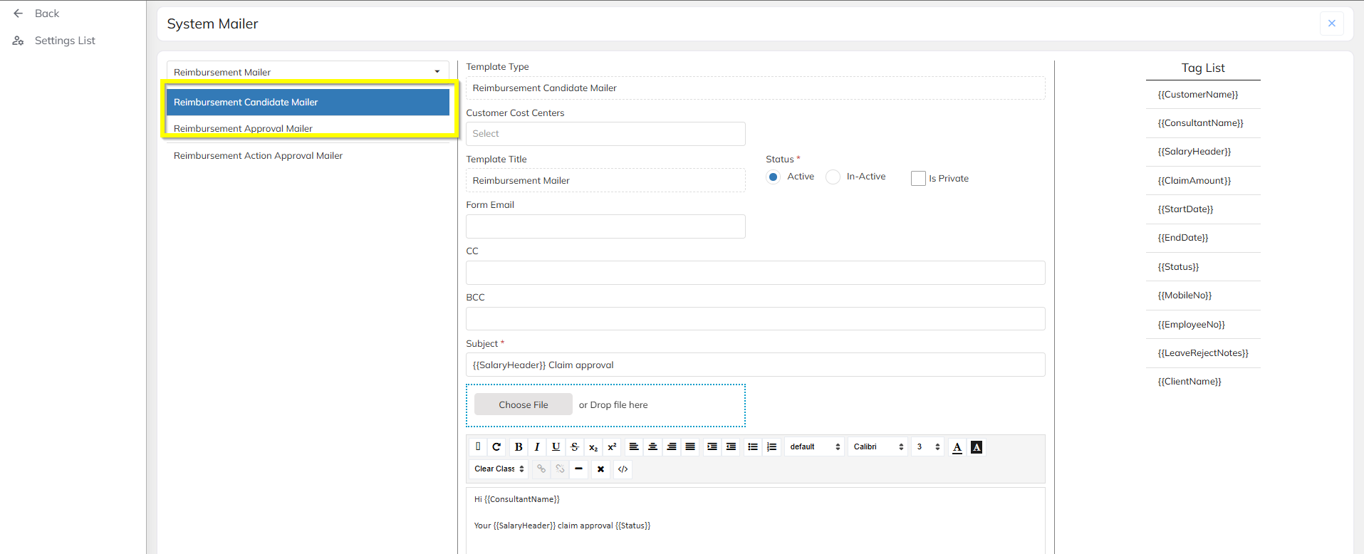 Use the supported system tags displayed beside the editor (for example: employee name, request number, approval status).