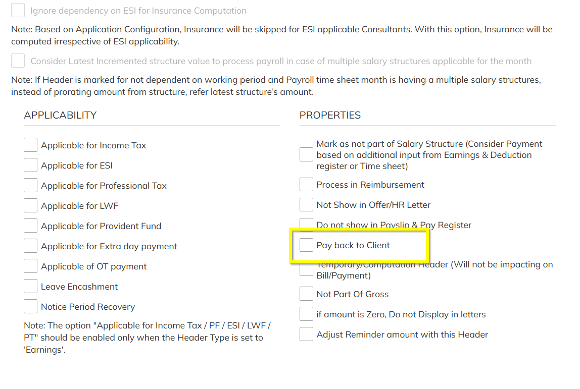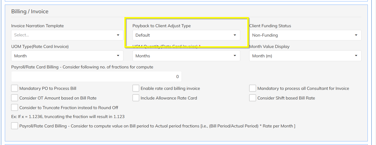 The same header is configured with Payback to Client – Adjustment Type set as “Default”.