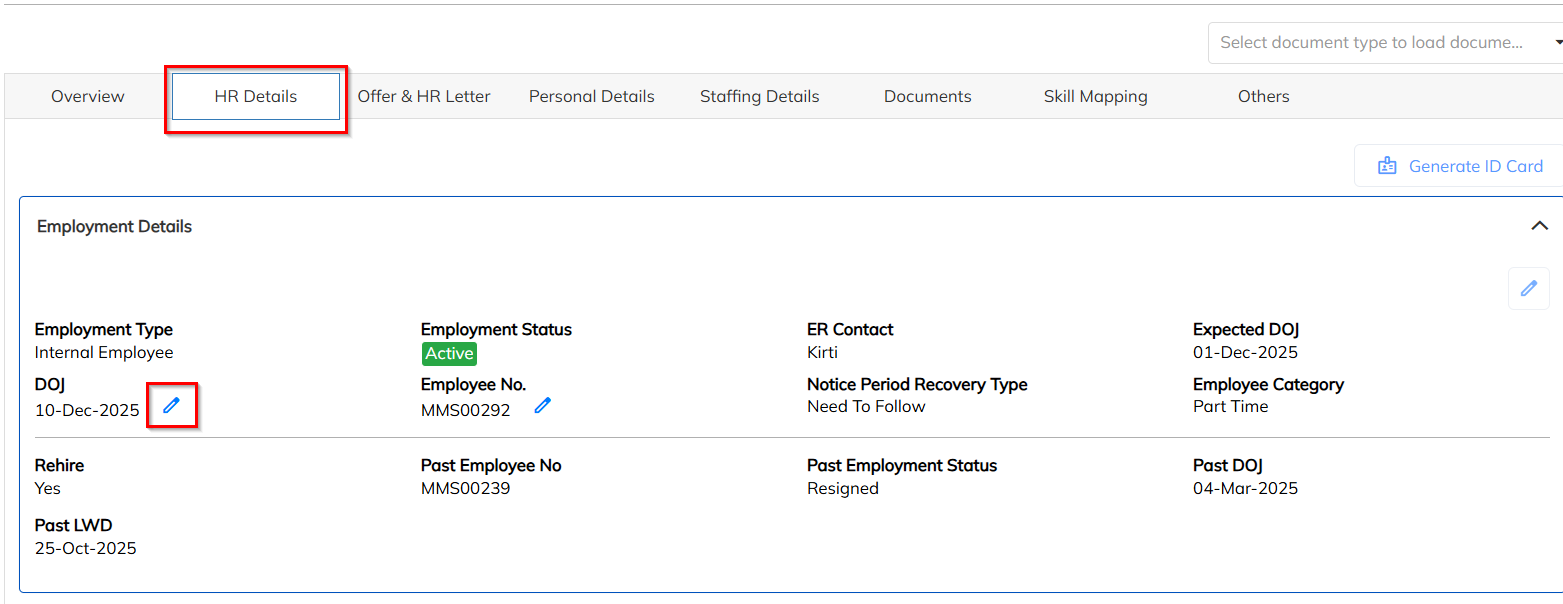 In the same employee profile, go to the HR Details section>>Click on the Edit (✏️) icon next to DOJ>>Update the DOJ to match the Start Date>>Select or enter the appropriate Reason for the DOJ change>>Click Update.