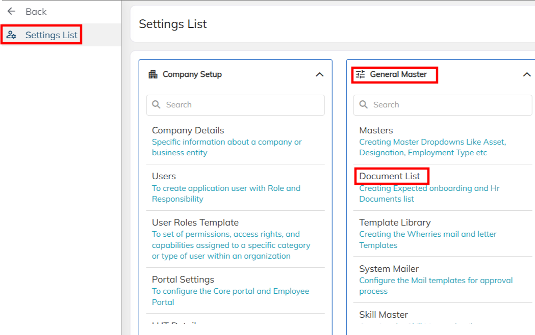 - Navigate to Setting List >>General Master >> Documents List.