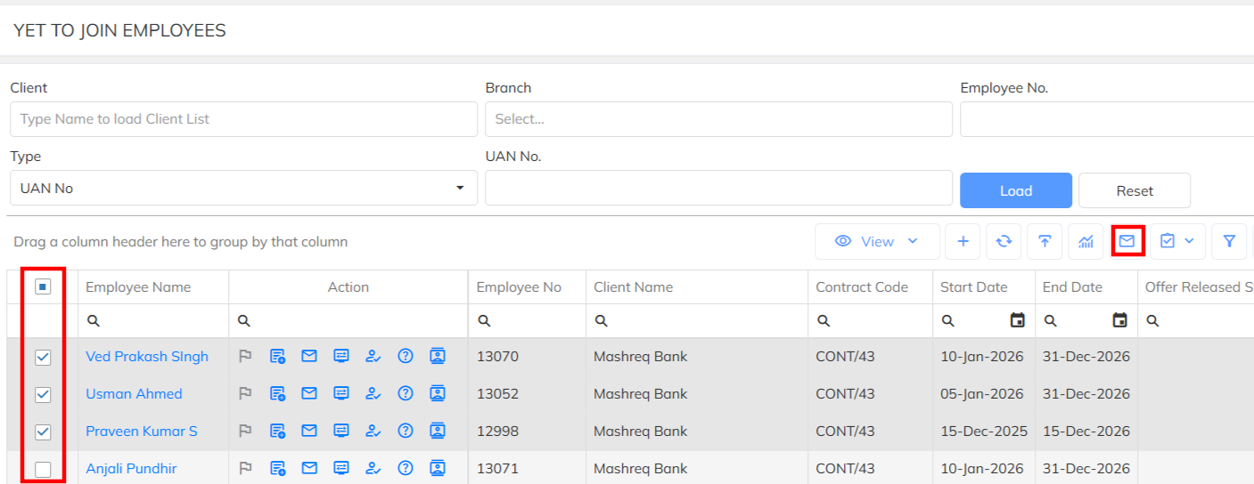 - Navigate to Employee Module >> Filter the selected employee and send the configured mailer in manually & bulk.