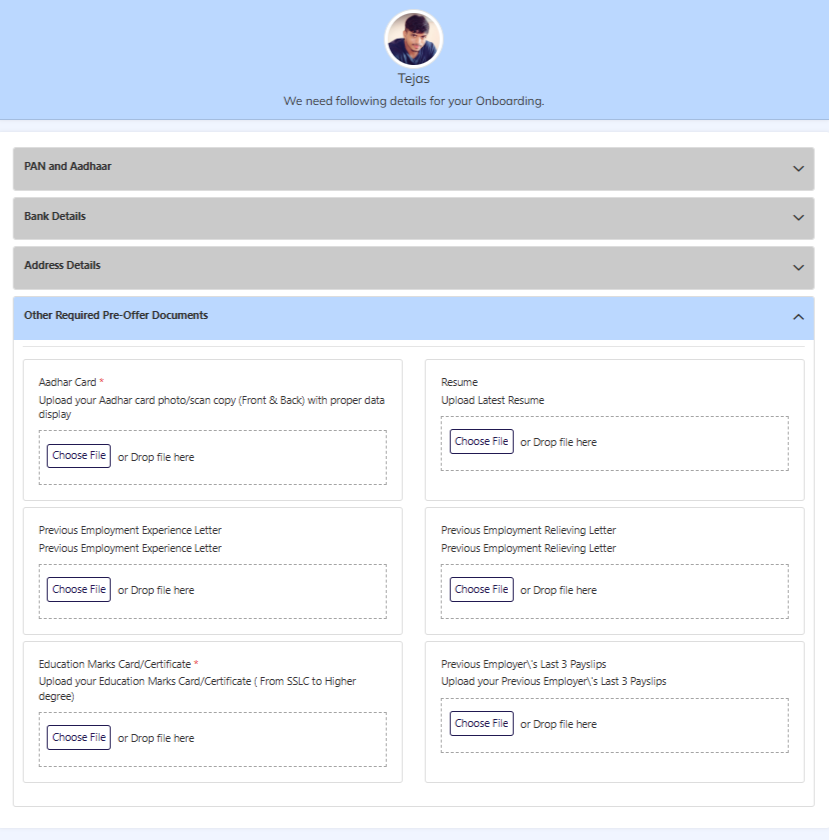 - Employee will update the all mandatory pre offer documents and submit.