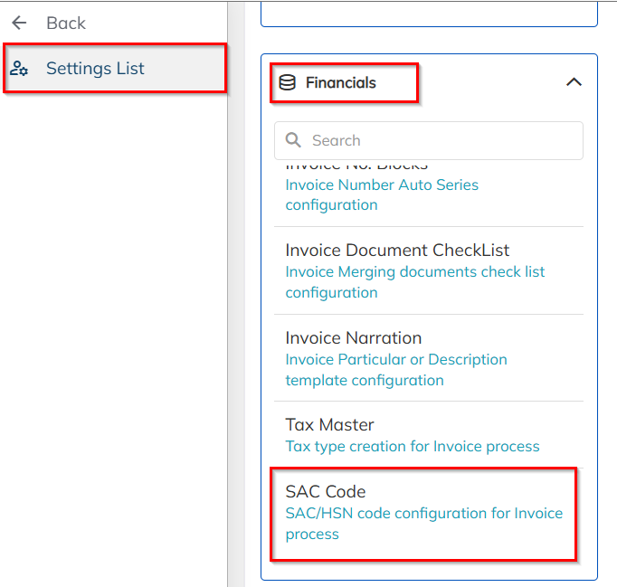 Navigate to Settings >>Select Financials>>Click on SAC Code.