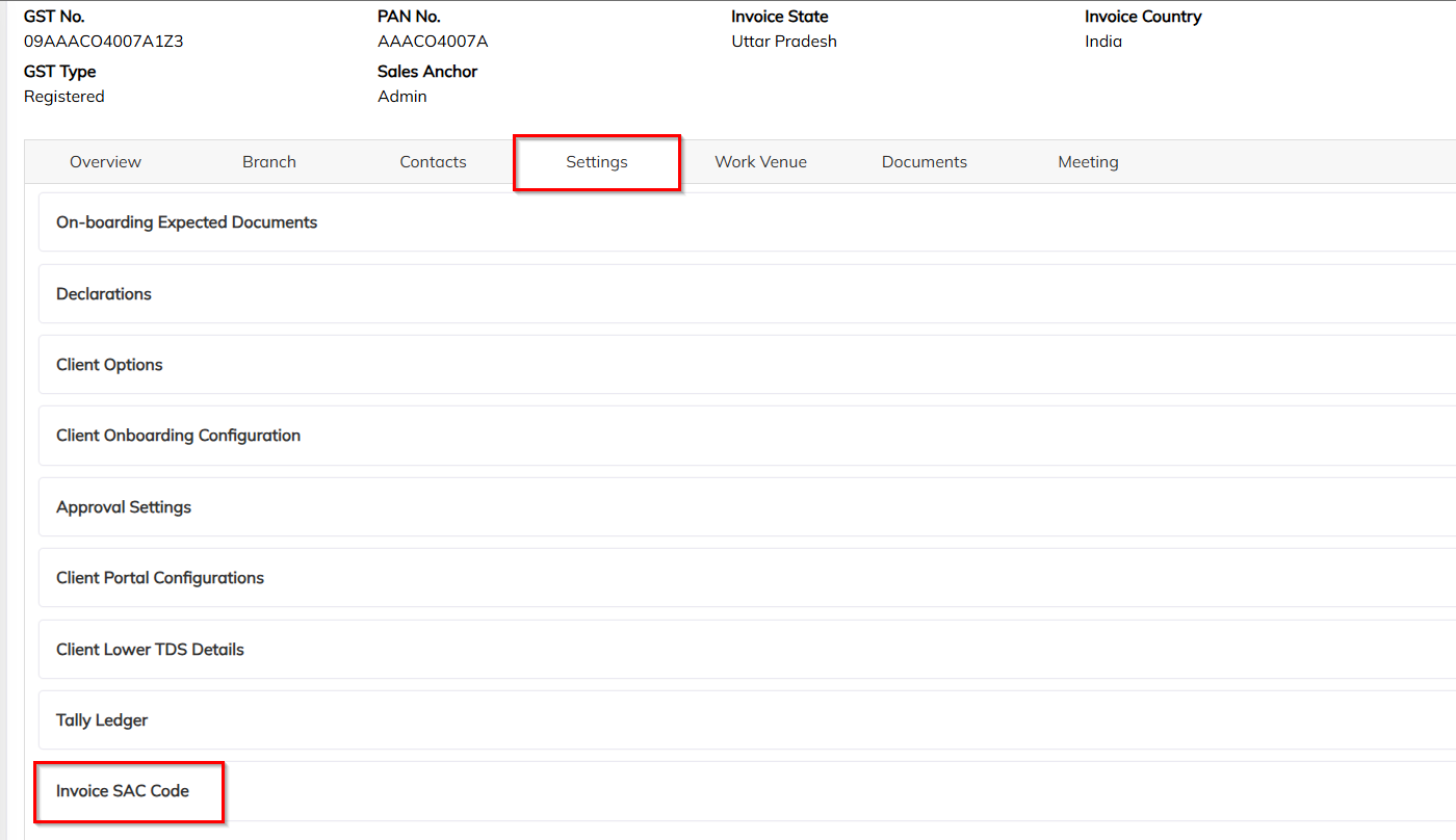 Client Module → Select Client → Settings → Invoice SAC Code