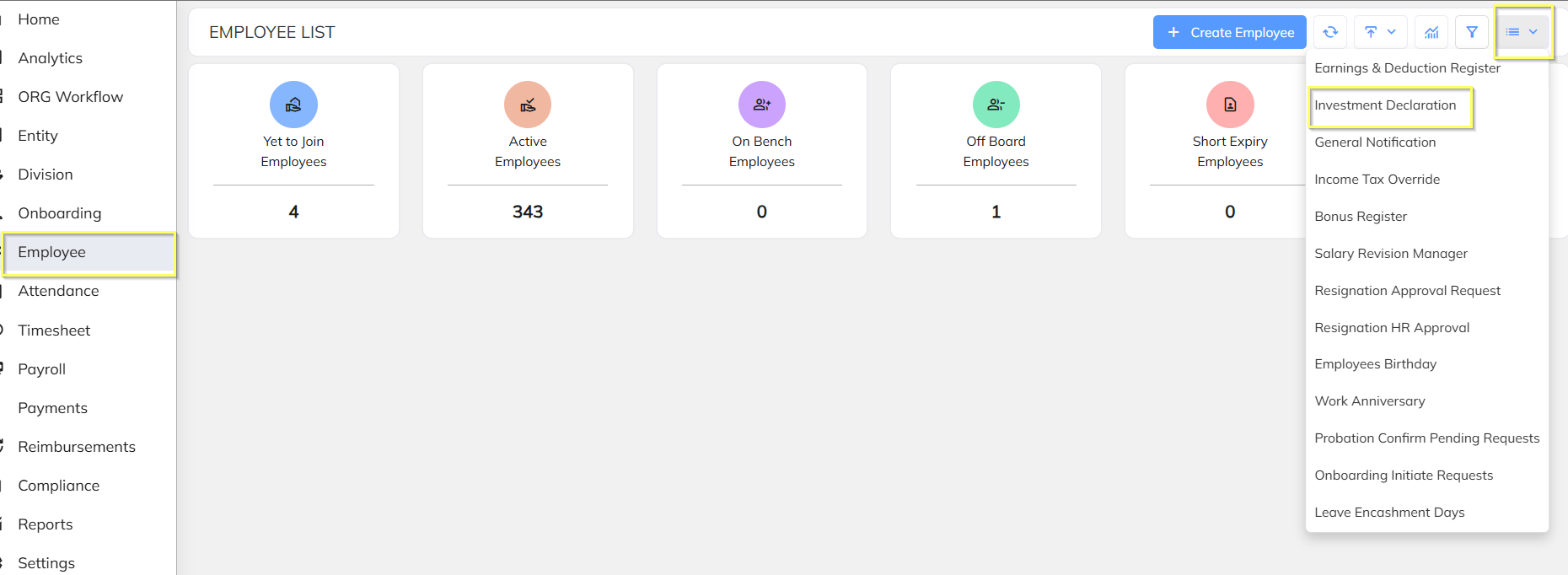 Navigate to the Employee Module >>Click on the Menu (three dots) available on the right side >>Select Investment Declarations