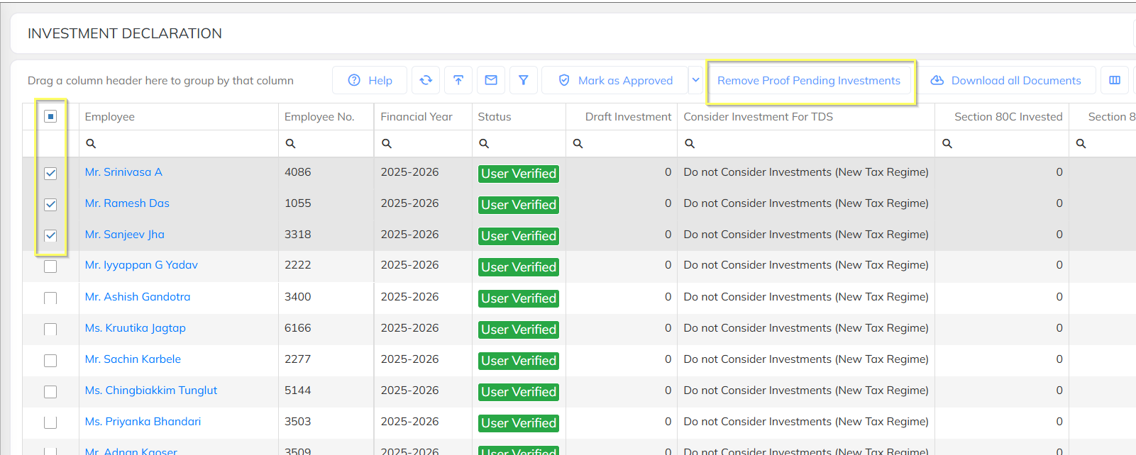 This guide explains how to remove pending investment declarations for employees where proofs have not been uploaded, specifically for employees under the Old Tax Regime.