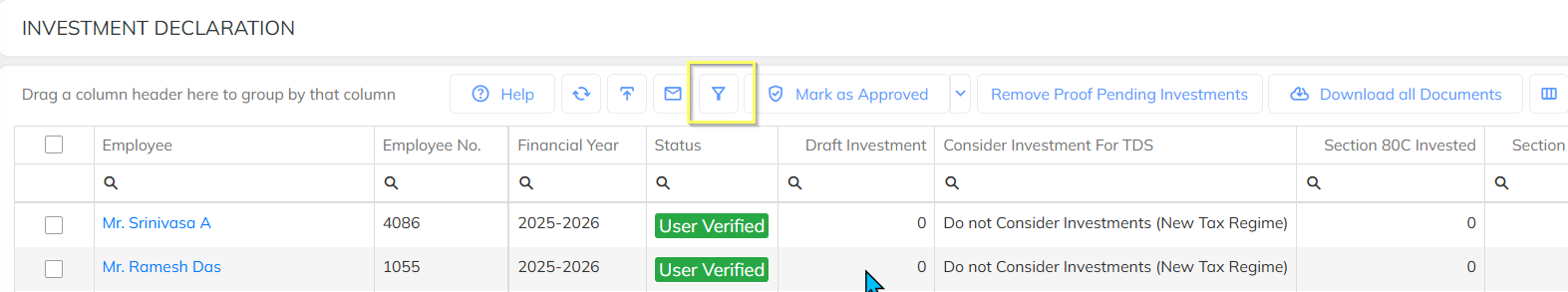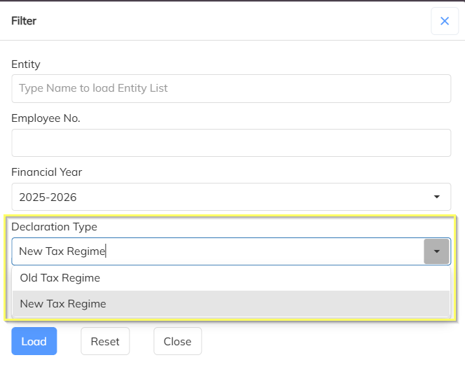 Click on Filter icon, a filter tab gets open >> select the Declaration Type (Old/New tax Regime)>> then click on Load.