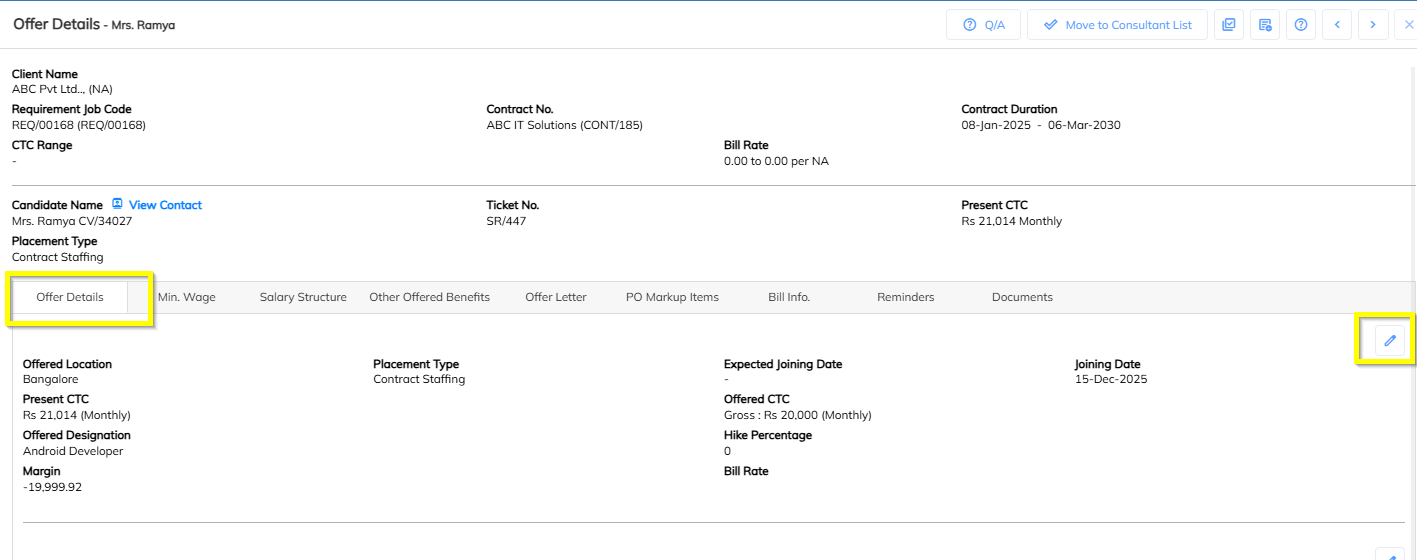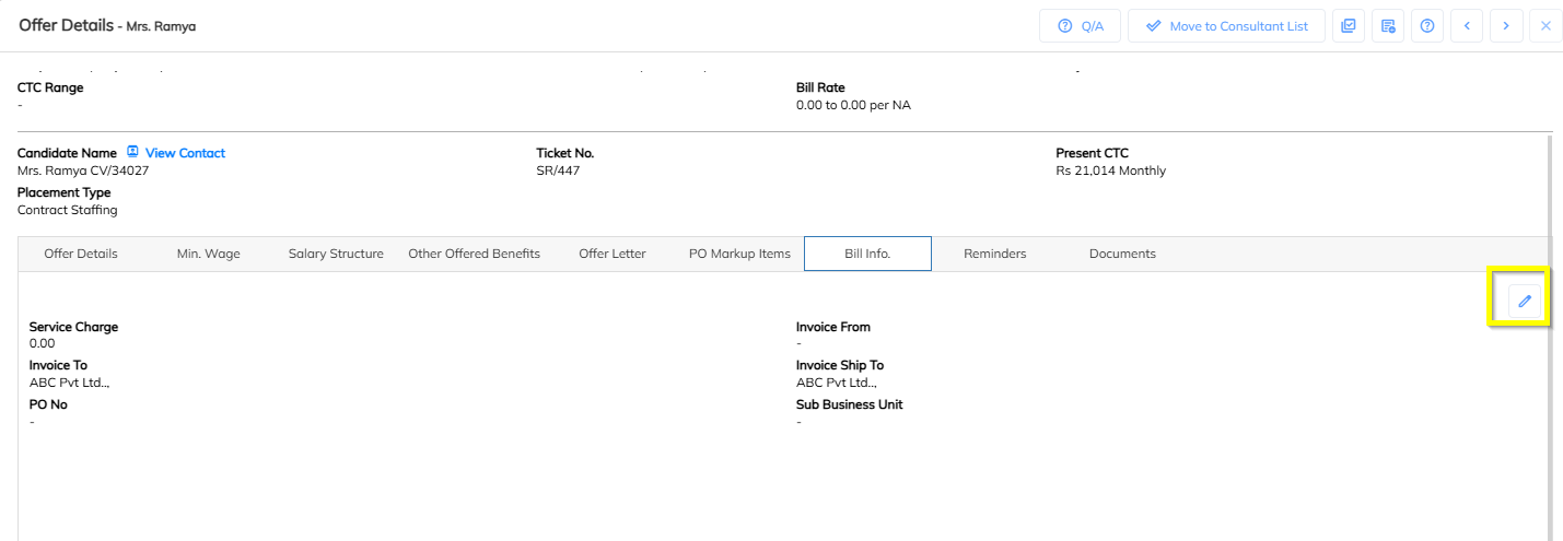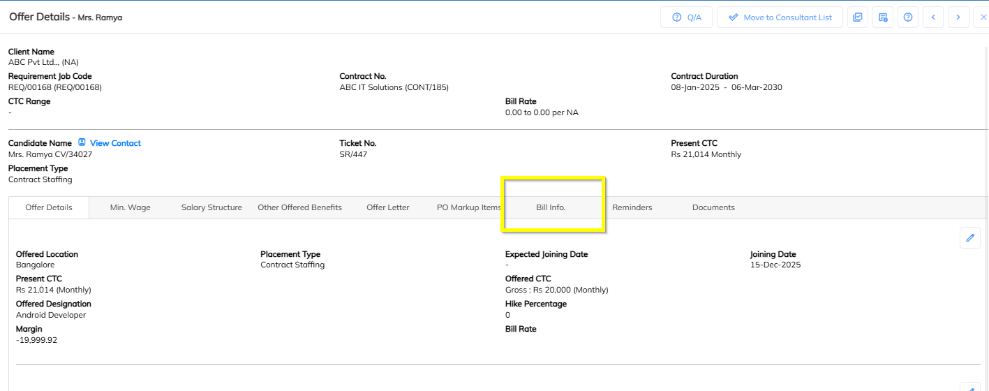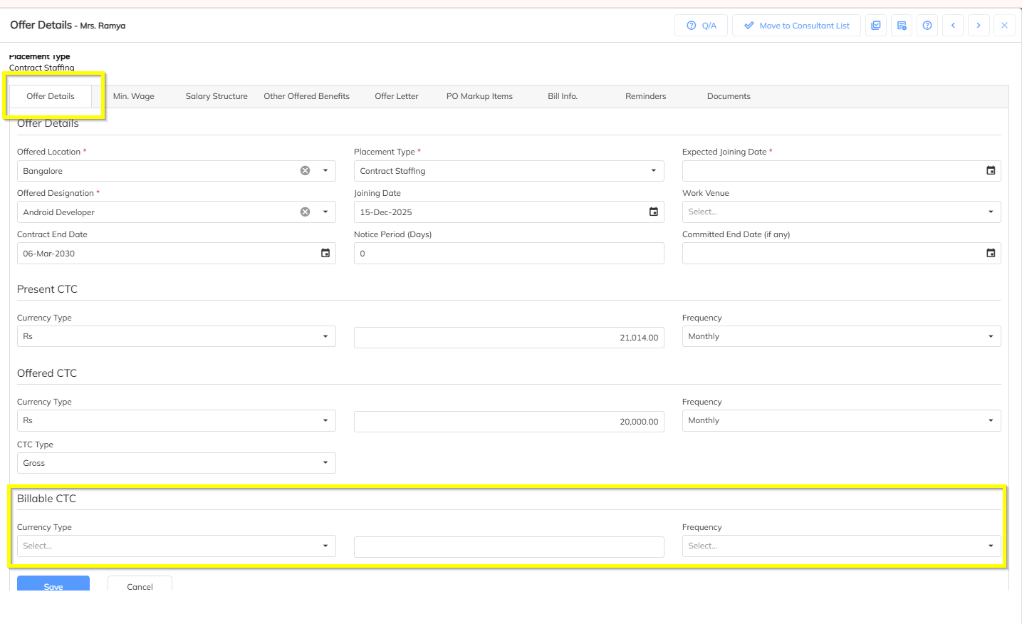 In Employee Offer Details, locate the field Billable CTC.