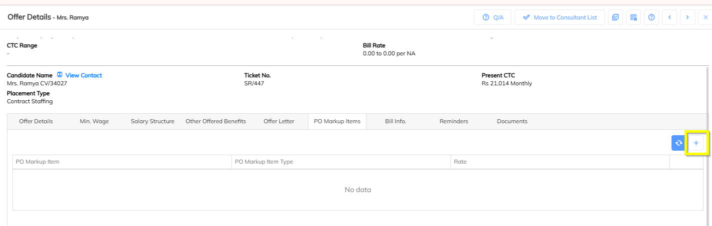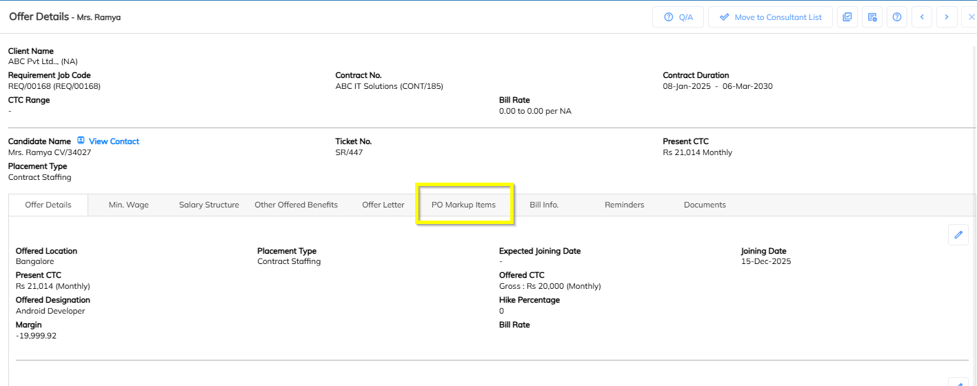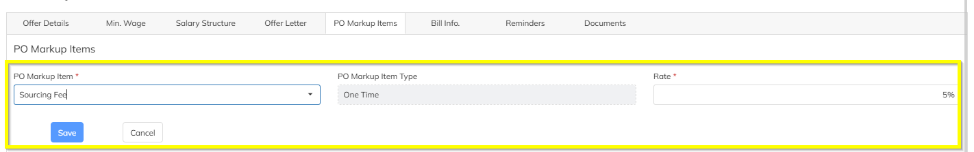 In Employee Offer Details, locate the section PO Markup Items.