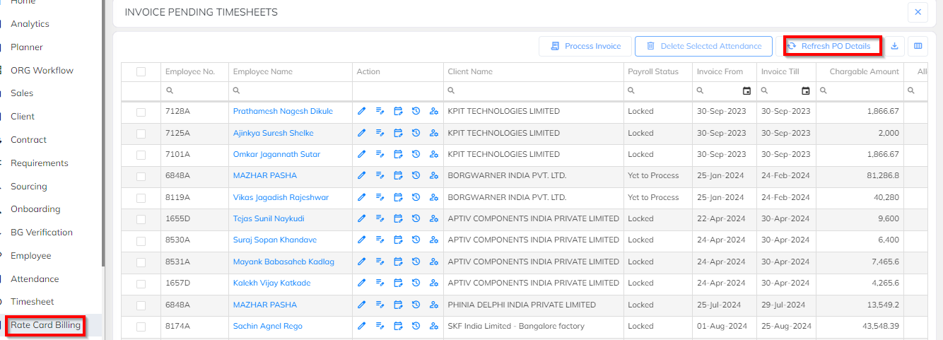 The PO Refresh option is available after Rate Card Timesheet processing.