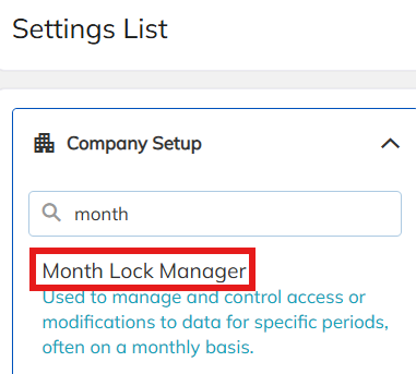 - Navigate to Settings → Company Setup → Search "Month Lock Manager"