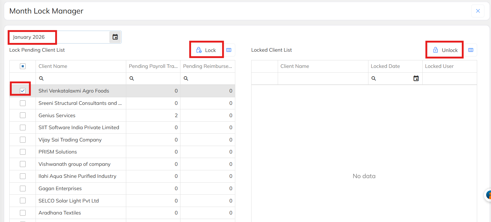 - Admin User: After statutory filings are completed, lock the relevant month for each client to prevent non-compliant reprocessing